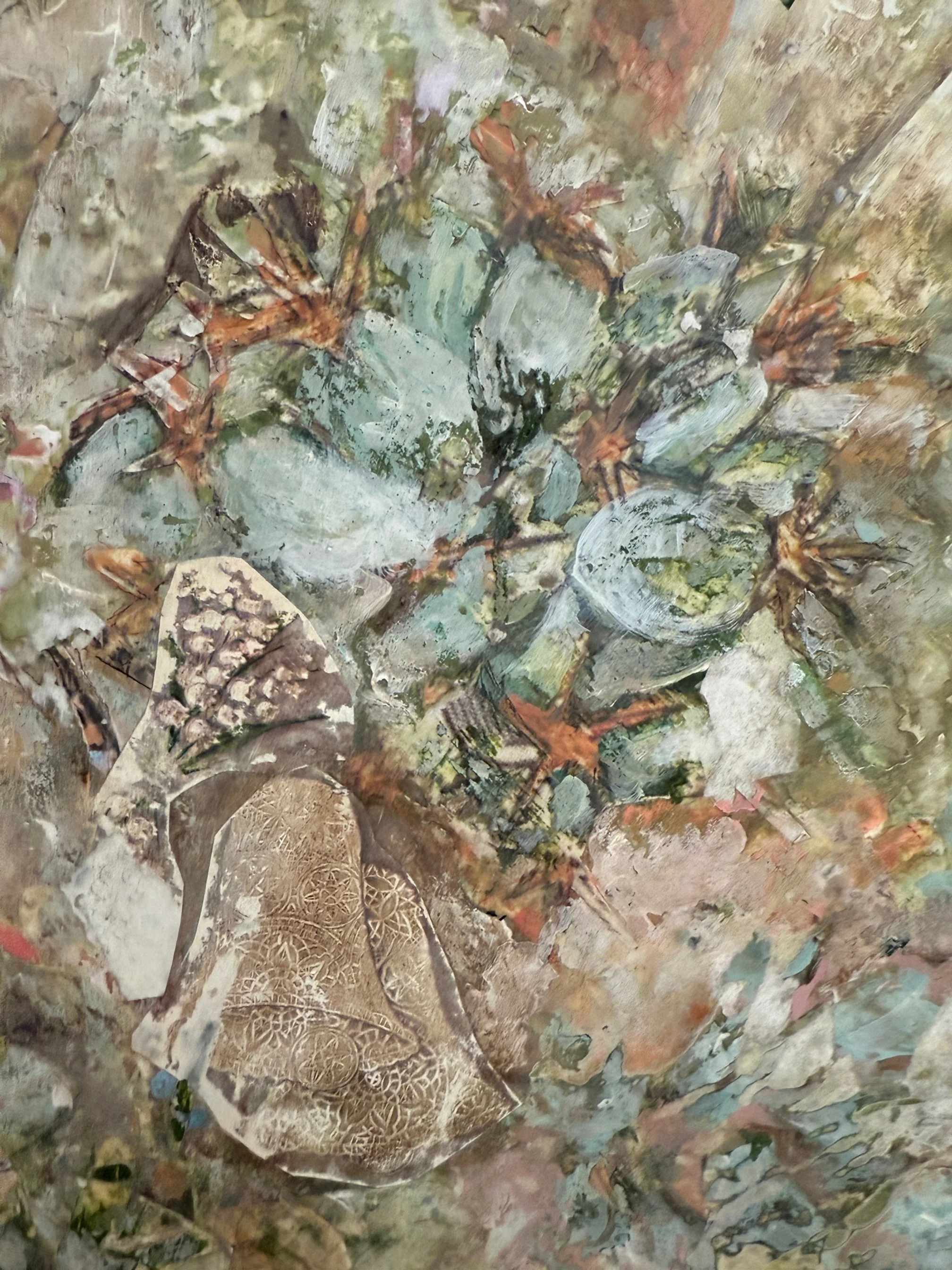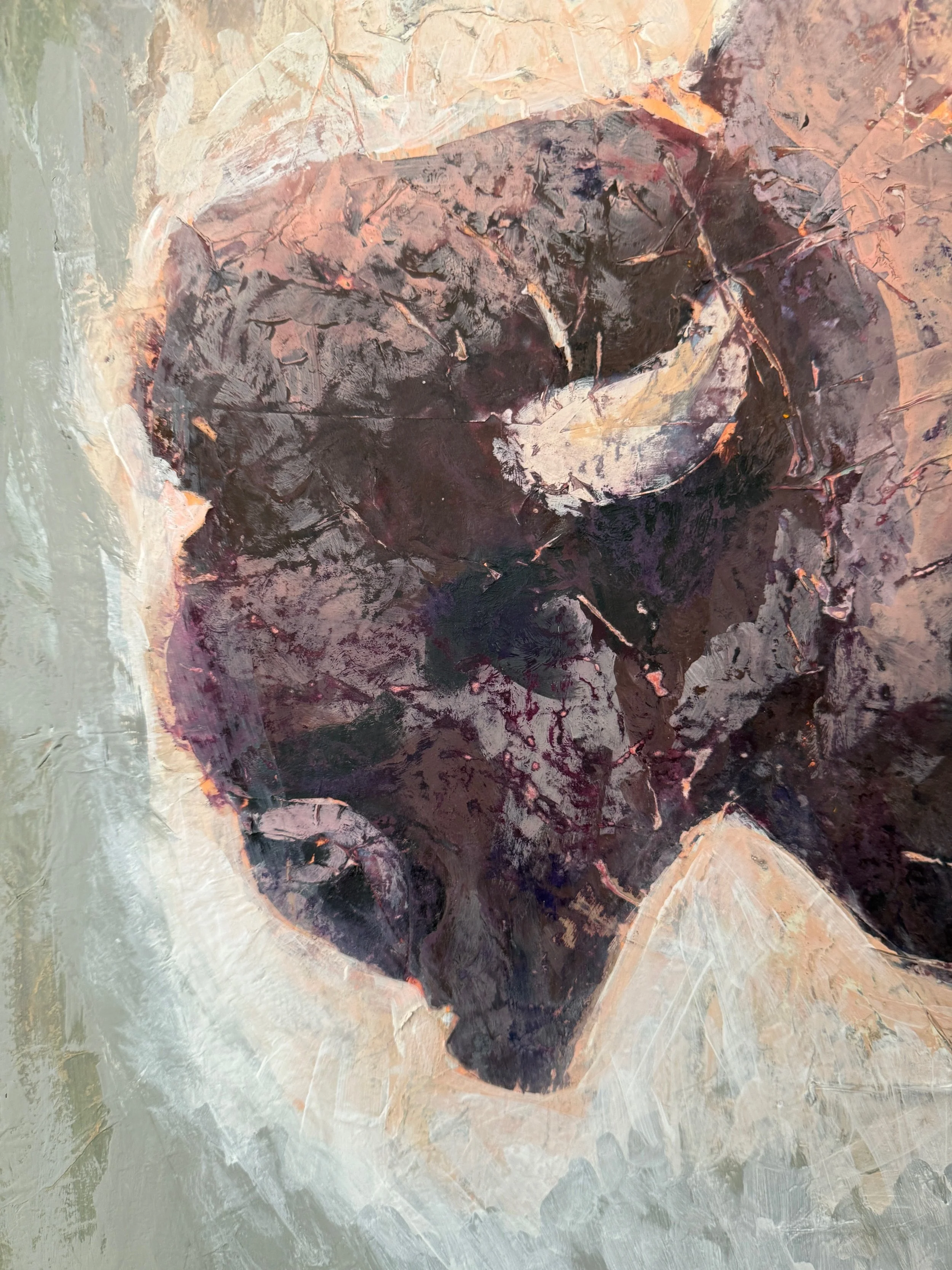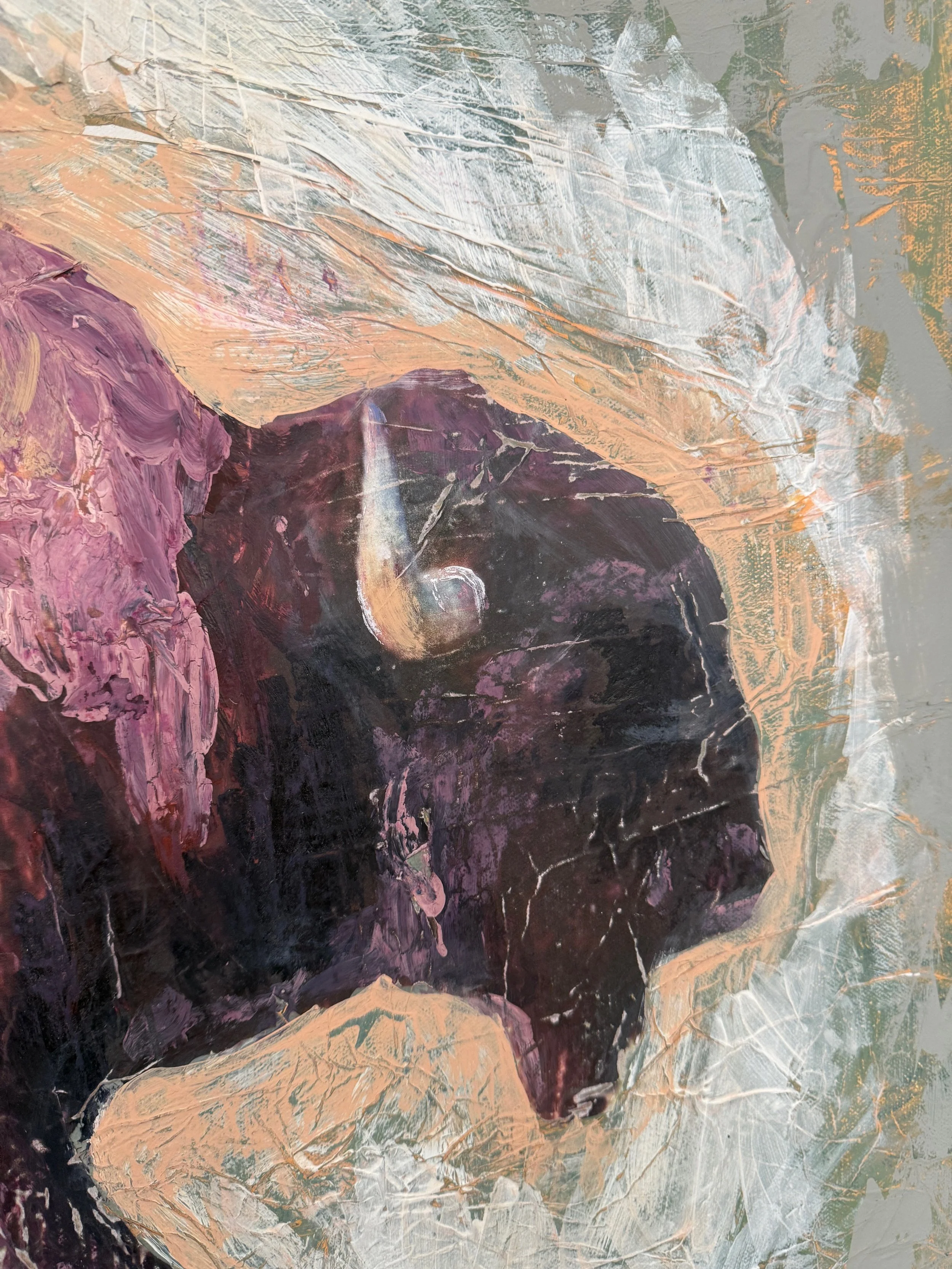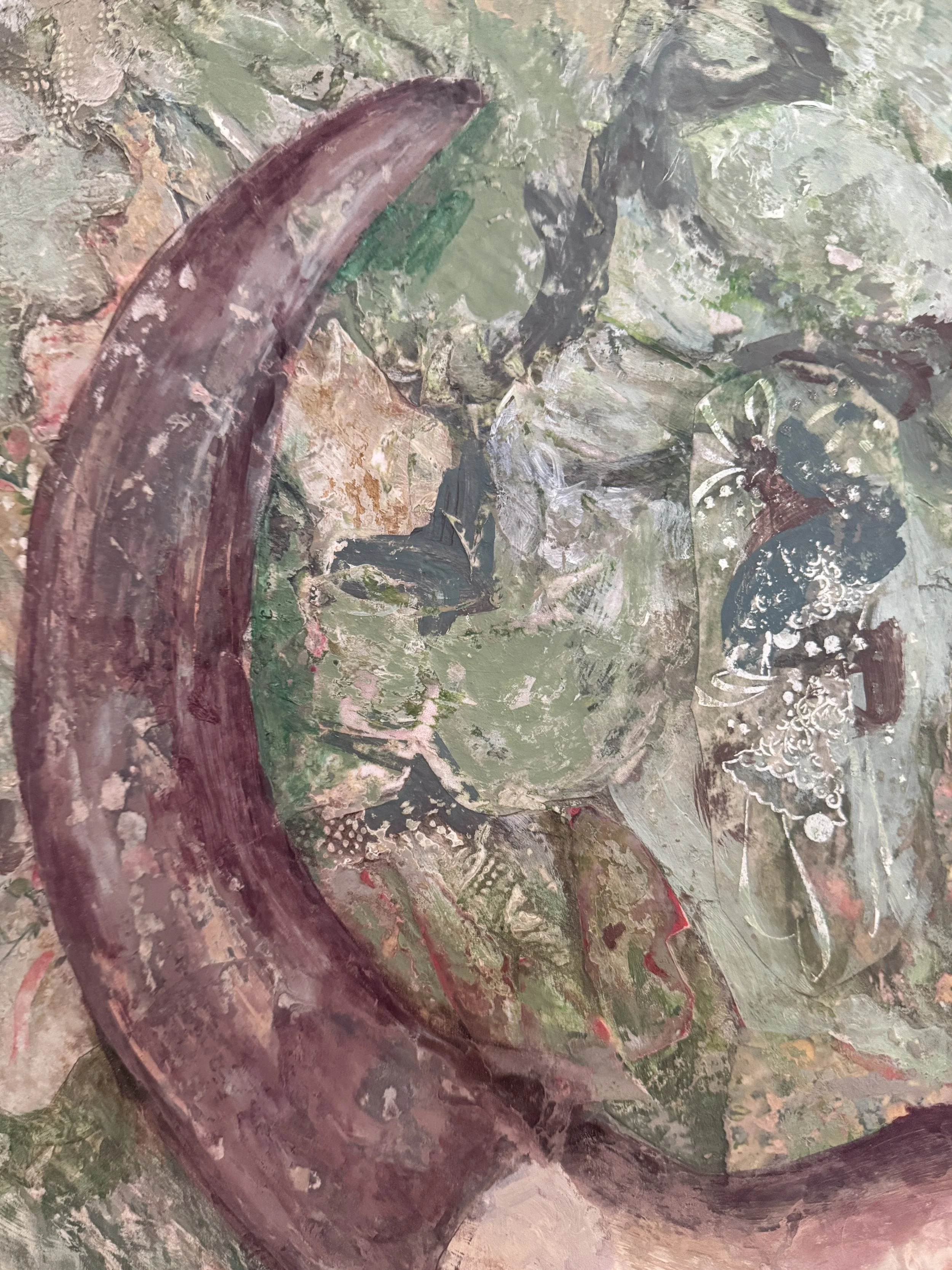 My process involves repurposing photographs, magazines, patterned papers, and personal ephemera, layering them onto the canvas. Through successive rounds of painting and sanding, I respond intuitively to the emerging forms and textures, allowing the artwork to evolve organically. By revealing the beauty found in weathered surfaces, I’m able to infuse my subjects with meaning. My technique allows me to not only capture their present state but reflects the stories they carry.